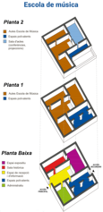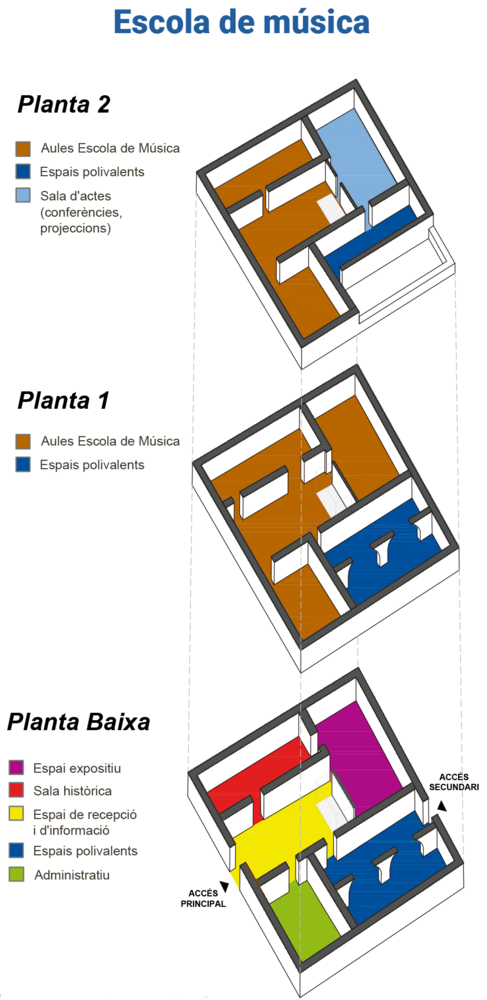 Les dues plantes superiors estarien dedicades a les aules de l’Escola de música i una petita sala d’actes per a concerts, espectacles, conferències, projeccions, etc... També s’inclou uns espais polivalents que donen continuïtat al que hi ha a la planta baixa.